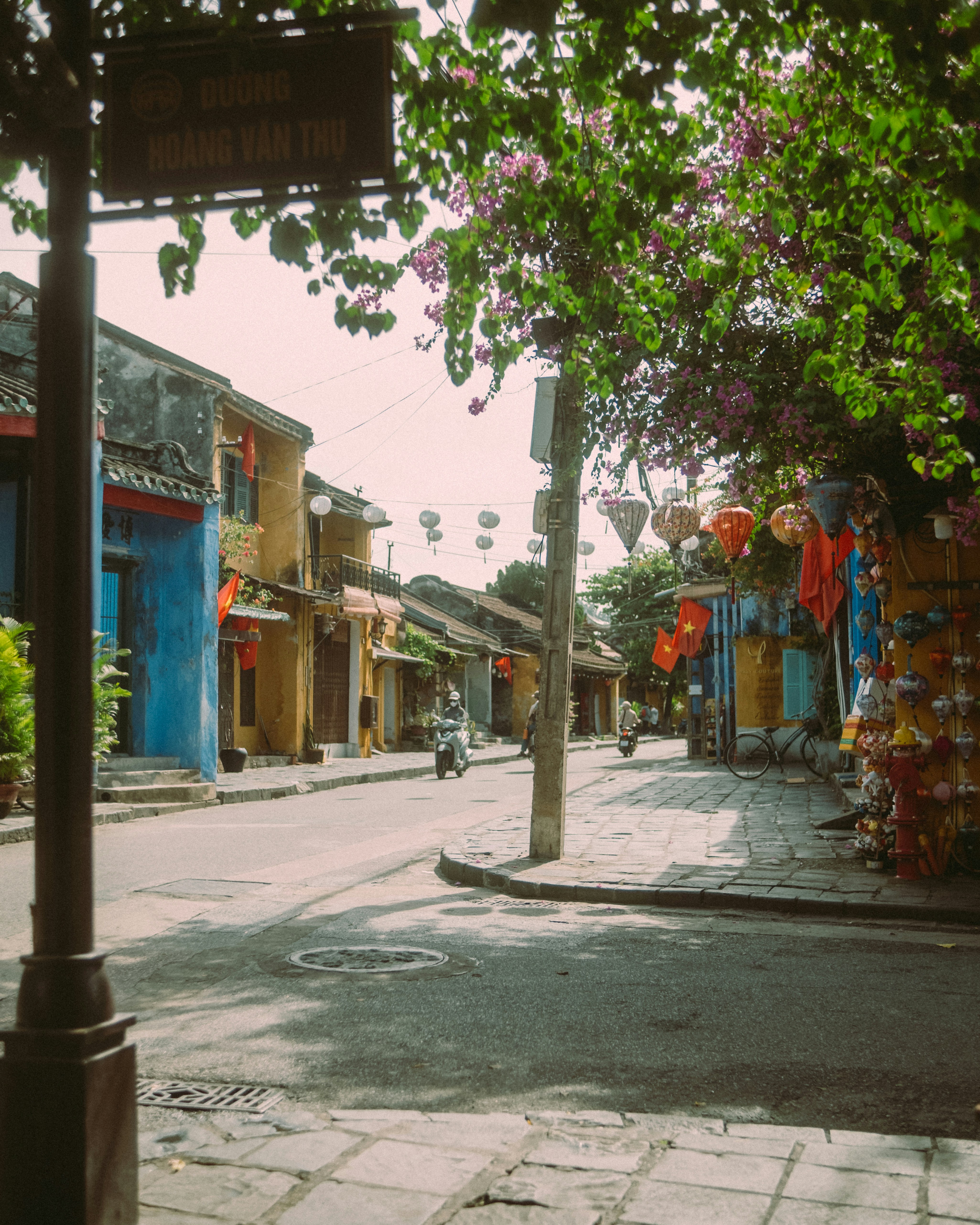 Colorful buildings line a street with lanterns and lanterns.