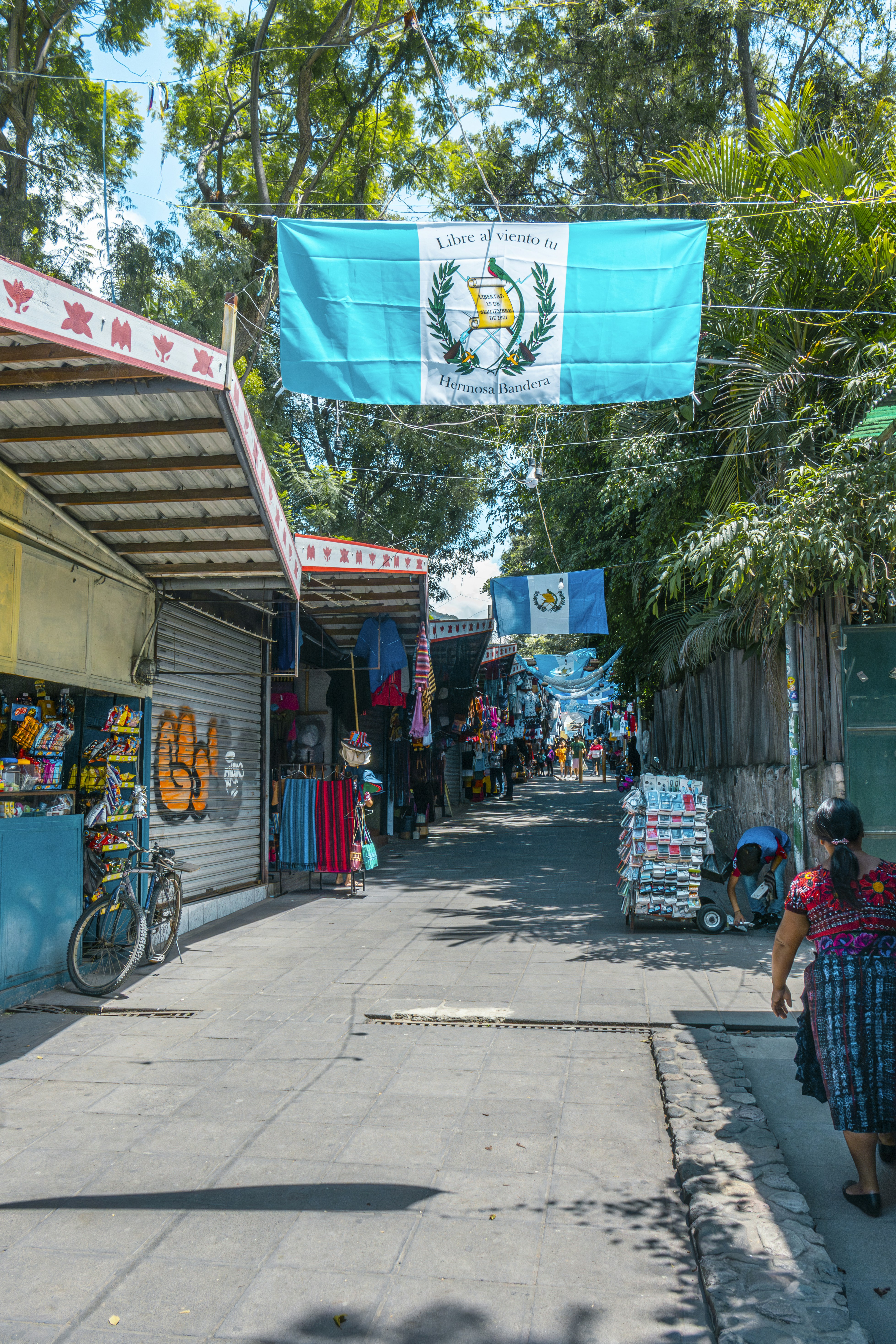 A woman walking down a street next to a store