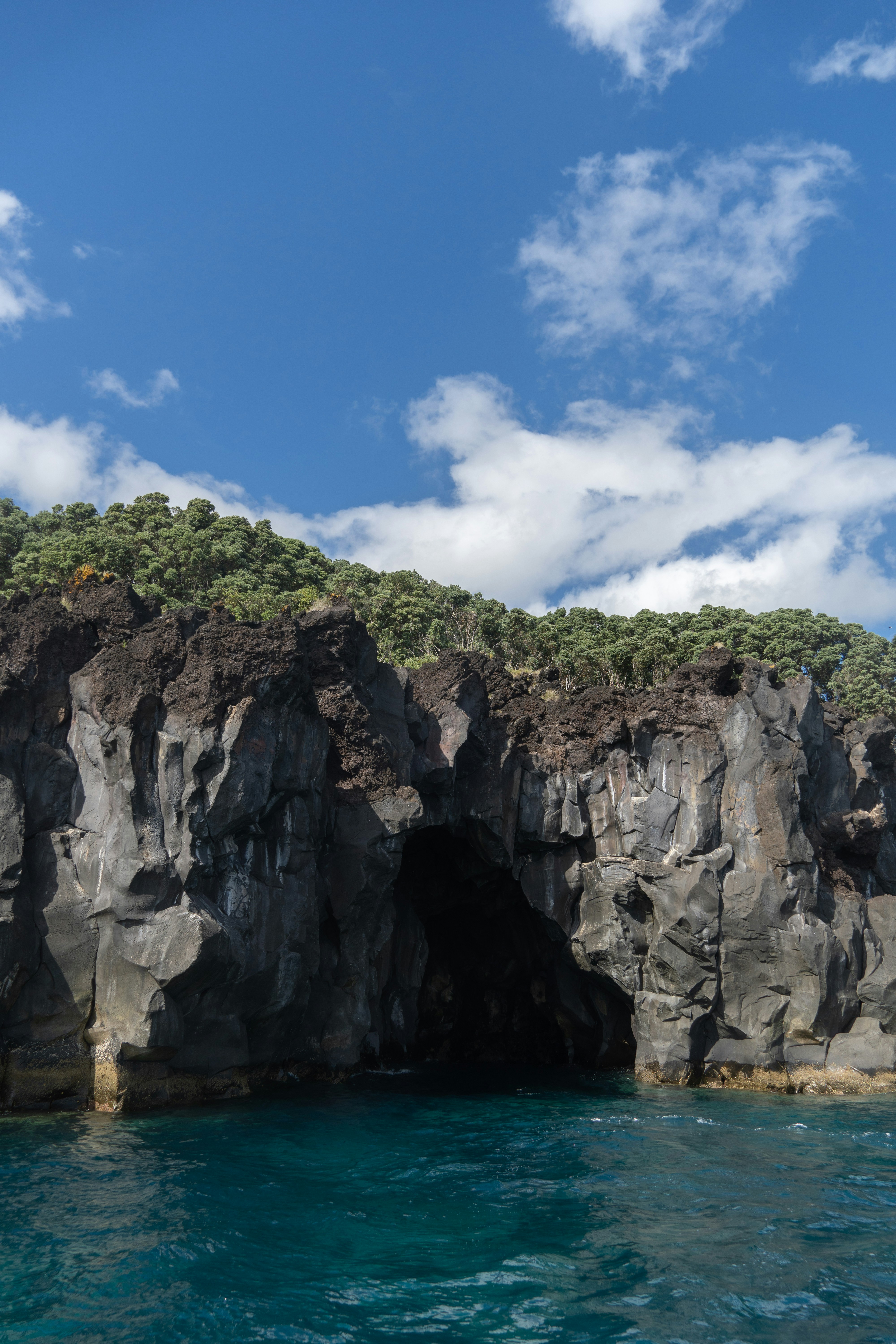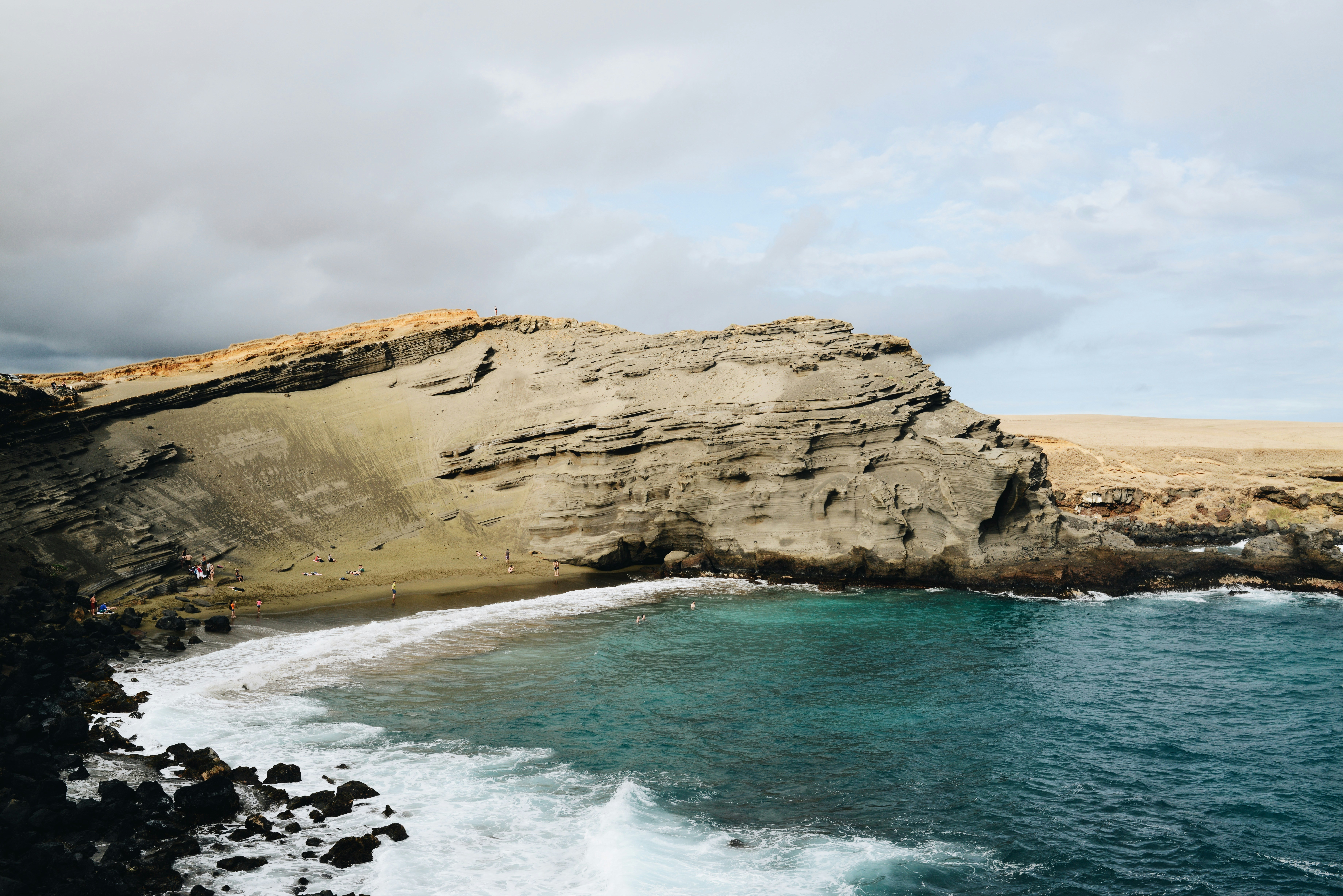 a rocky cliff overlooks a body of water