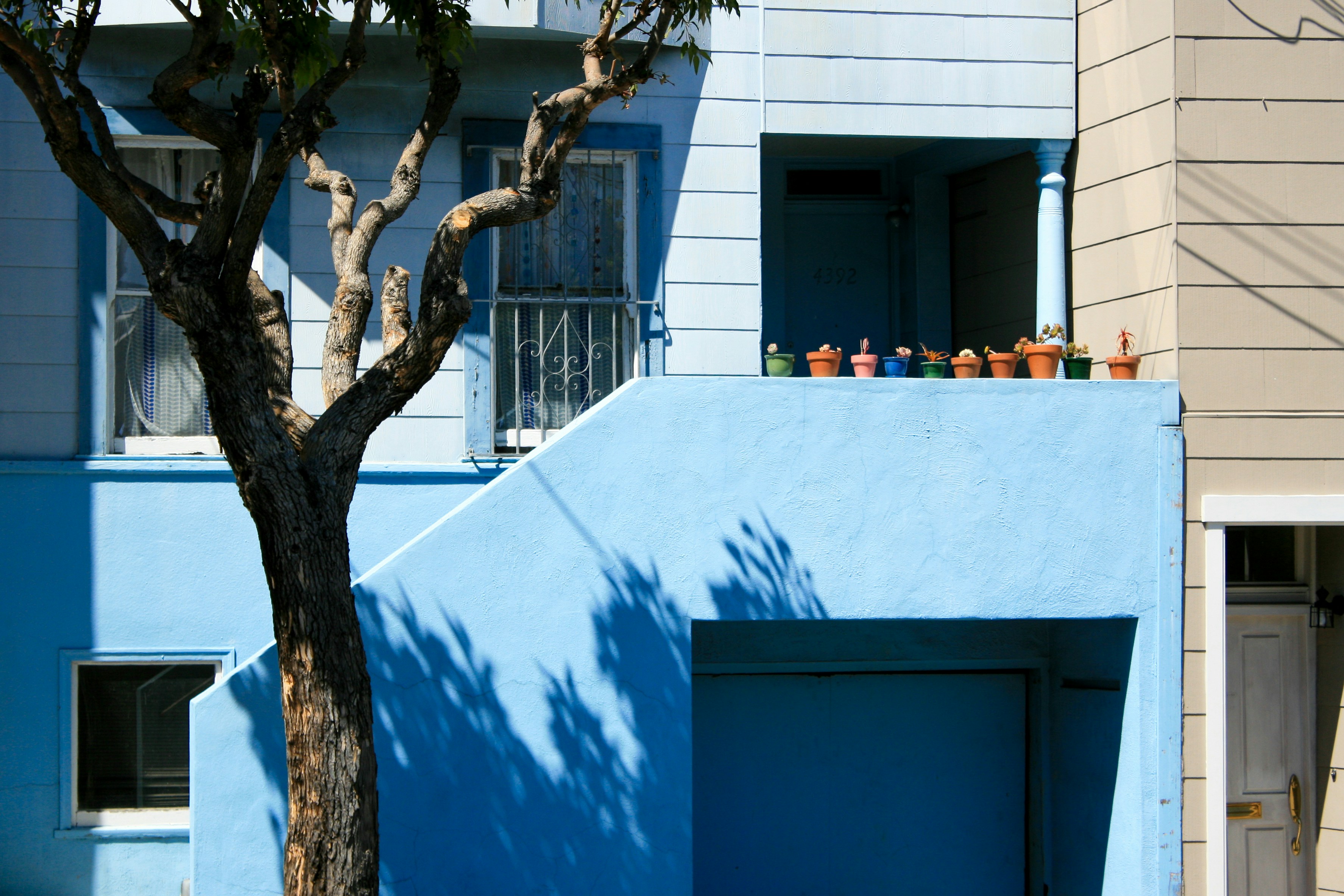 a blue building with a tree in front of it