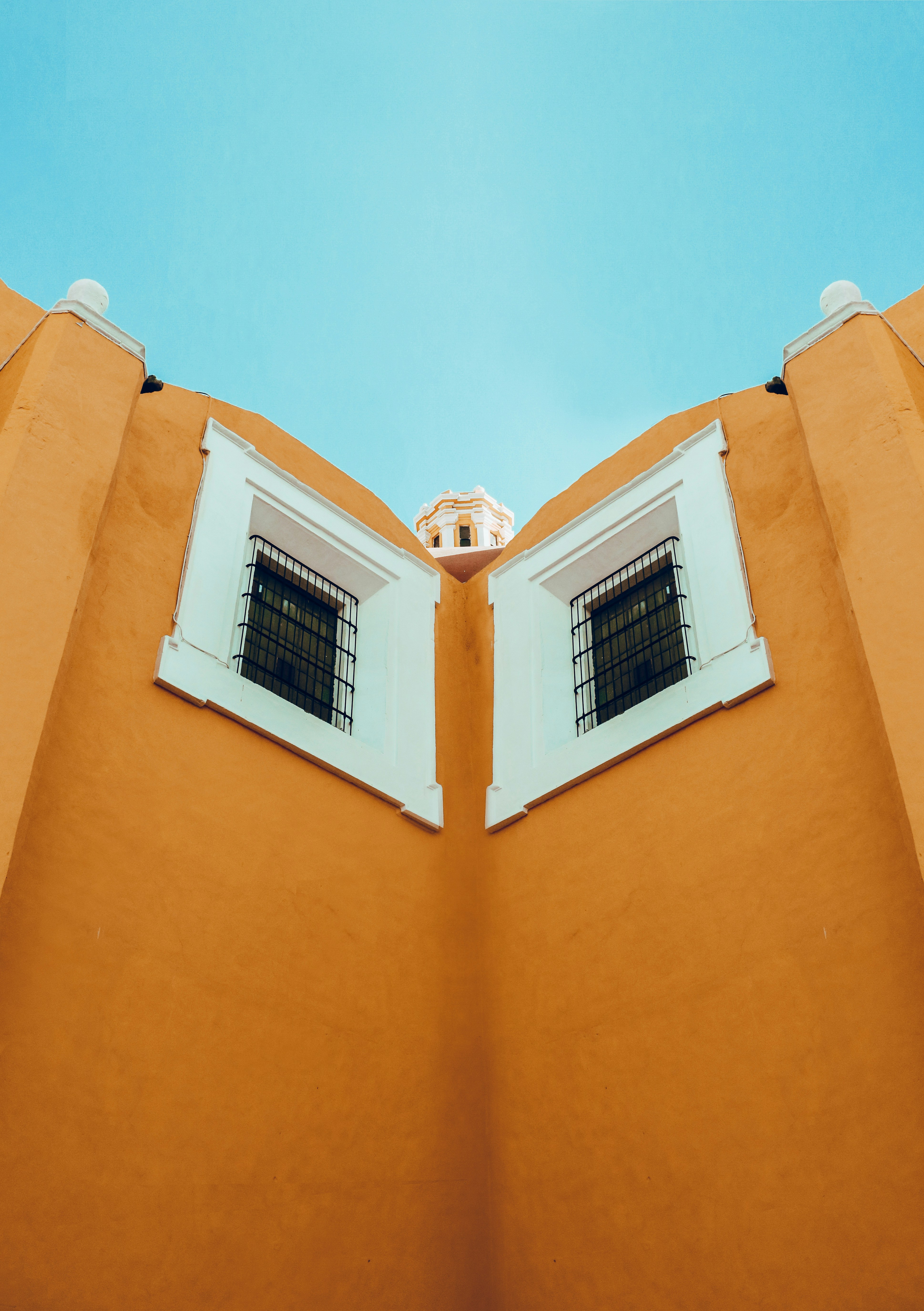 a blue and yellow church with stairs leading up to it
