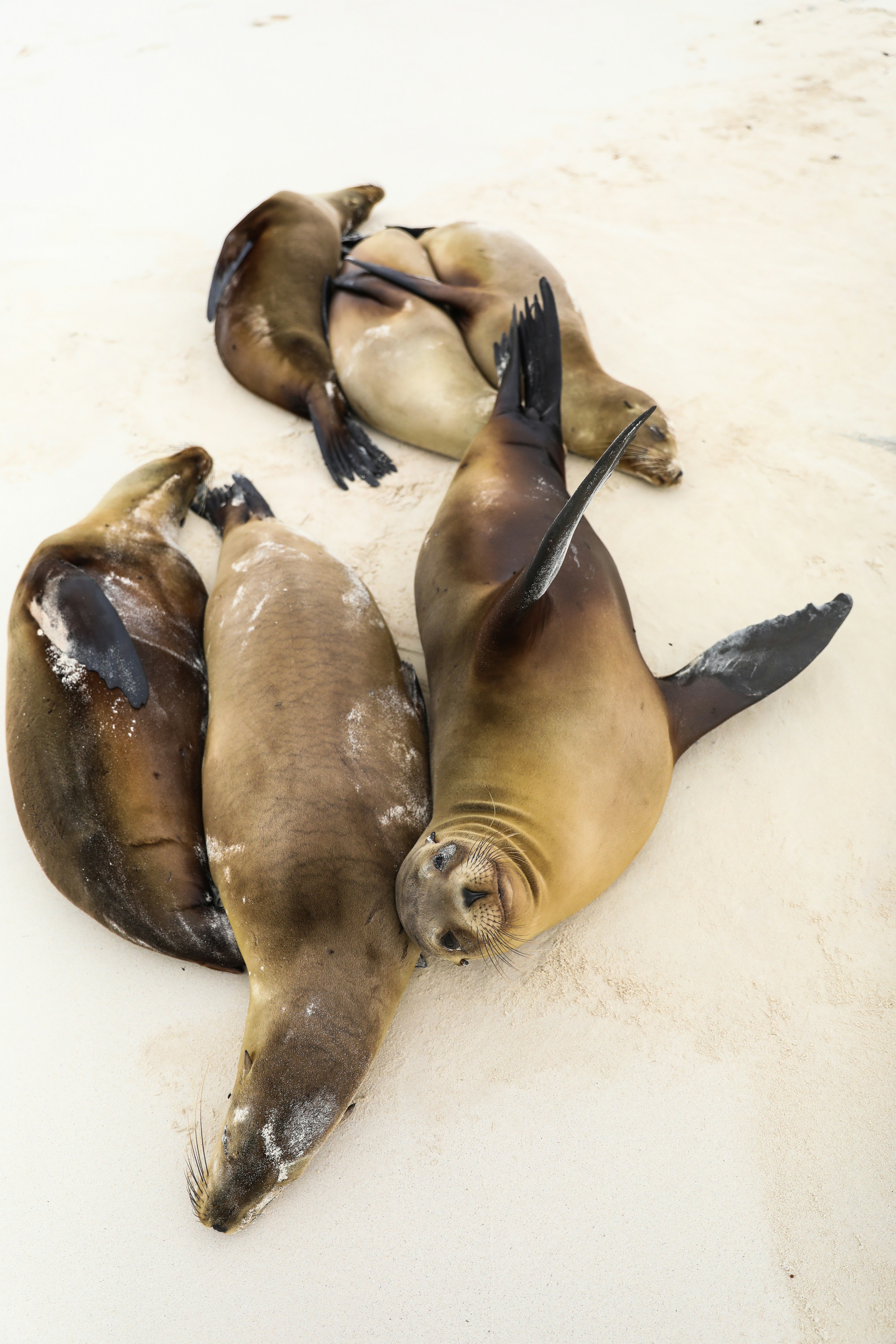 A couple of sea lions laying on top of a sandy beach